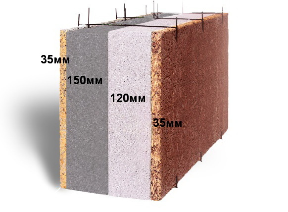 Опалубка, из которой строится дом, состоит из щепо-цементных плит и пенополистерола, между которых монтируется арматура и заливается Гидротехнический бетон А500С В25.